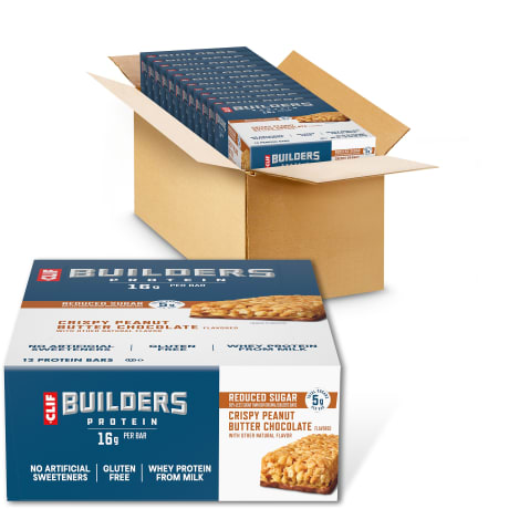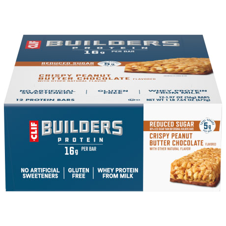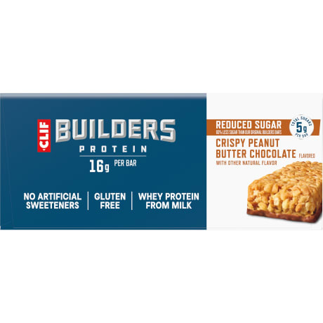 CLIF BUILDERS Crispy Peanut Butter Chocolate Gluten-Free Protein Bars are an excellent source of protein from whey, soy and nuts and contain no artificial sweeteners. This crispy high protein bar with reduced sugar* has only 5 grams of sugar per bar. And, they're packed with 16 grams of protein and 3 grams of fiber** per bar. Available in a convenient bulk snack case. *60% less sugar than original CLIF BUILDERS bars. **Contains 13 g total fat per bar.