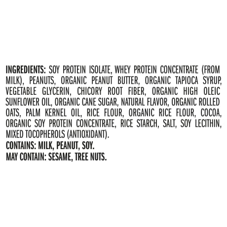 INGREDIENTS: SOY PROTEIN ISOLATE, WHEY PROTEIN CONCENTRATE (FROM MILK), PEANUTS, ORGANIC PEANUT BUTTER, ORGANIC TAPIOCA SYRUP, VEGETABLE GLYCERIN, CHICORY ROOT FIBER, ORGANIC HIGH OLEIC SUNFLOWER OIL, ORGANIC CANE SUGAR, NATURAL FLAVOR, ORGANIC ROLLED OATS, PALM KERNEL OIL, RICE FLOUR, ORGANIC RICE FLOUR, COCOA, ORGANIC SOY PROTEIN CONCENTRATE, RICE STARCH, SALT, SOY LECITHIN, MIXED TOCOPHEROLS (ANTIOXIDANT). CONTAINS: MILK, PEANUT, SOY. MAY CONTAIN: SESAME, TREE NUTS.