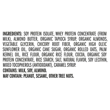 INGREDIENTS: SOY PROTEIN ISOLATE, WHEY PROTEIN CONCENTRATE (FROM MILK), ALMOND BUTTER, ORGANIC TAPIOCA SYRUP, ORGANIC ALMONDS, VEGETABLE GLYCERIN, CHICORY ROOT FIBER, ORGANIC HIGH OLEIC SUNFLOWER OIL, ORGANIC CANE SUGAR, ORGANIC ROLLED OATS, PALM KERNEL OIL, RICE FLOUR, ORGANIC RICE FLOUR, COCOA, ORGANIC SOY PROTEIN CONCENTRATE, RICE STARCH, SALT, NATURAL FLAVOR, SOY LECITHIN, MIXED TOCOPHEROLS (ANTIOXIDANT), CARAMEL SYRUP. CONTAINS: MILK, SOY, ALMOND. MAY CONTAIN: PEANUT, SESAME, OTHER TREE NUTS.