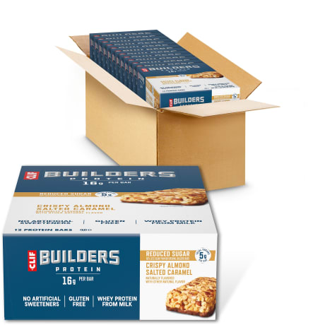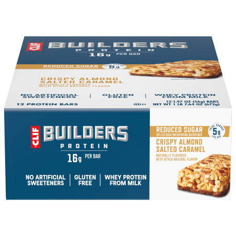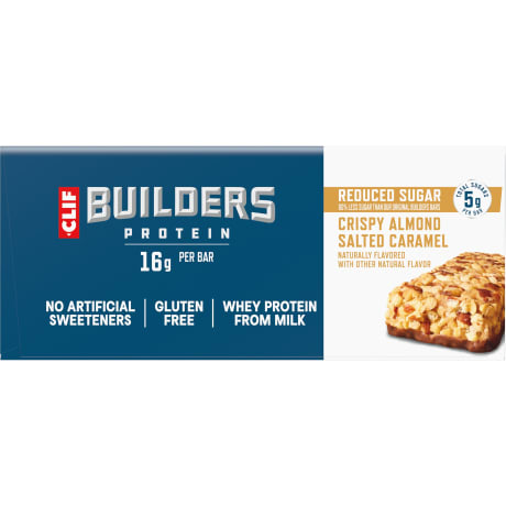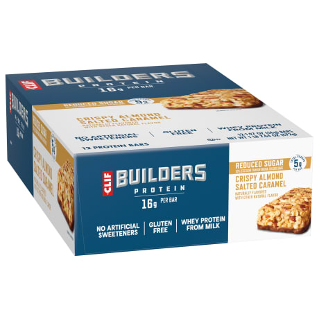 CLIF BUILDERS Crispy Almond Salted Caramel Protein Bars are an excellent source of protein from whey, soy and nuts, and are made with reduced sugar* while maintaining great taste. Packed with 16 grams of protein and 4 grams of fiber** per bar, these protein bars are made with real almonds, adding to the satisfying texture of this delicious protein snack. Available in a convenient bulk snack case, these gluten free protein bars contain no artificial sweeteners. *60% less sugar than original CLIF BUILDERS bars. **Contains 12 g of total fat per bar.